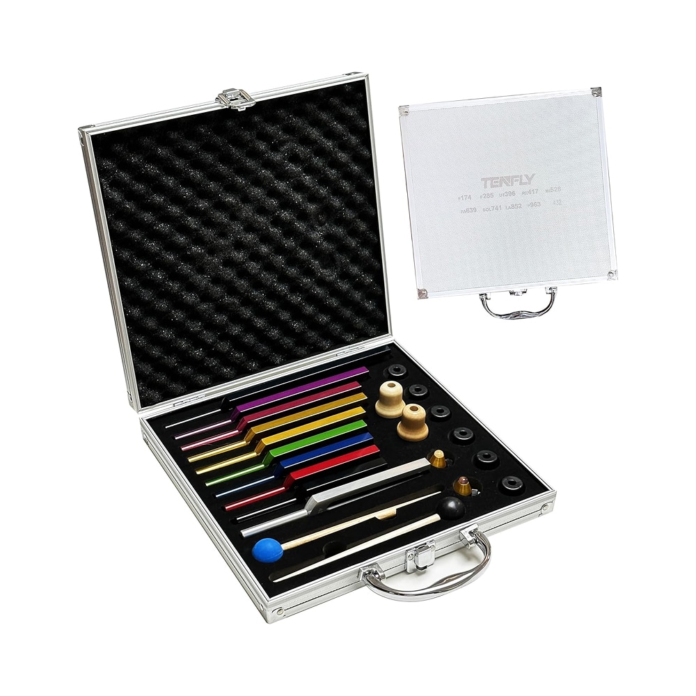 Die leichte Aluminium-Legierung garantiert Haltbarkeit und klare Resonanz, während das komplette Zubehör-Set mit Samttasche, Reinigungstuch, Gummihammer und Schraubenschlüssel praktische Handhabung ermöglicht. Besonders geeignet für Yoga-Enthusiasten und tägliche Entspannungsroutinen, erzeugen die Gabeln sanfte Vibrationswellen, die Stress abbauen und innere Ruhe fördern.