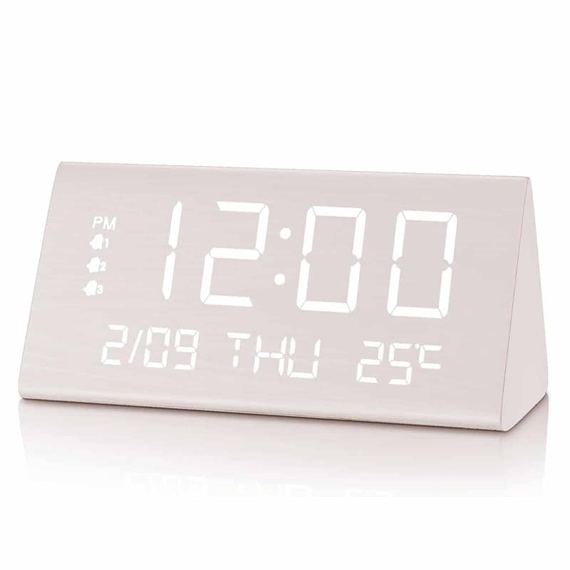 Der JALL Tageslichtwecker punktet mit seinem eleganten Holzdesign, das ihn zu einem stilvollen Dekorationselement für jedes Schlafzimmer macht. Das übersichtliche Display zeigt gleichzeitig Datum, Wochentag, Temperatur und alle drei Alarme sowie AM/PM-Anzeige – perfekt für die schnelle Orientierung am Morgen.